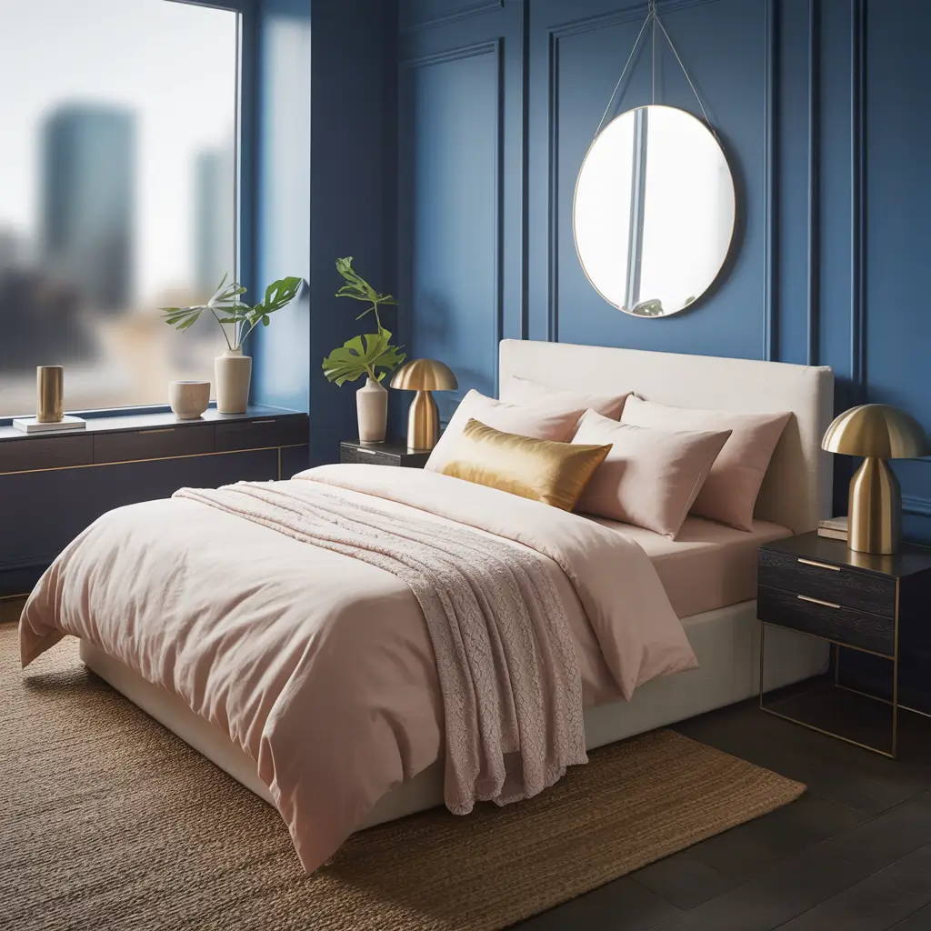 Now we’re talking about making a statement. A navy accent wall behind your bed creates instant drama, while soft pink textiles keep things from feeling too heavy. I helped my sister execute this in her apartment, and her landlord actually asked if we could do the same in his master bedroom.