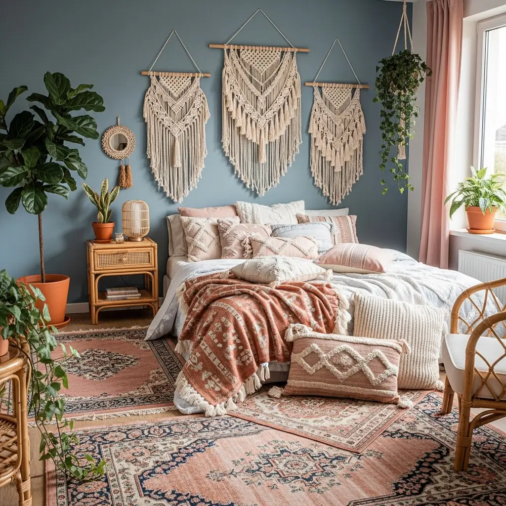 • Layered Textures: This is crucial for boho. Think macramé wall hangings in natural white, woven jute rugs, chunky knit pink blankets, and linen bedding in varying shades of pink and blue.