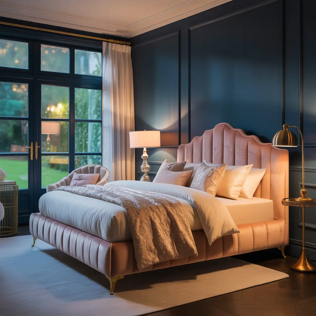 • Velvet Headboard: Invest in a velvet upholstered headboard in a deep blue (like navy or sapphire) or a rich pink (like fuchsia or dusty rose). This will be the focal point.