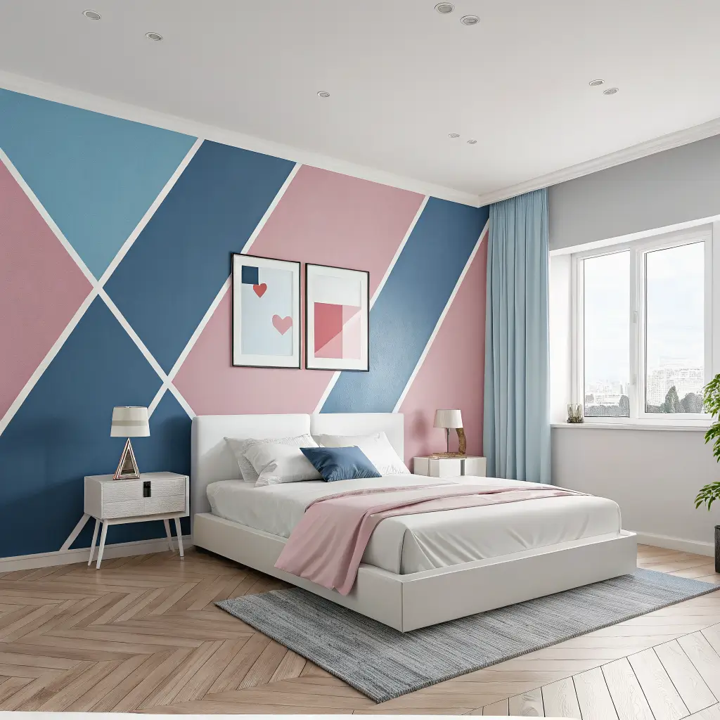 • The Canvas Wall: Select one wall, typically the one behind your bed or the first one you see upon entering, for your geometric blue and pink design. This wall will draw the eye and define the space.