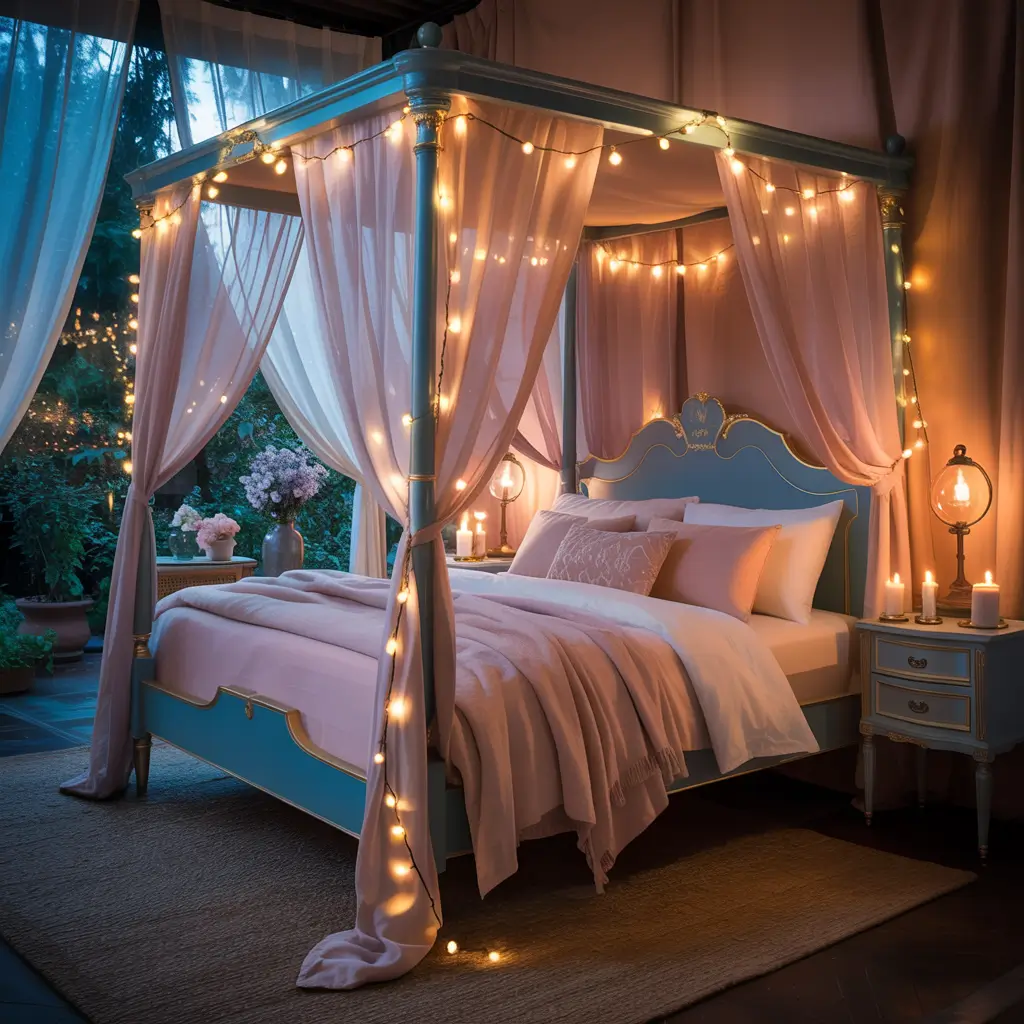 • Soft Lighting: Emphasize warm, diffused lighting. A dimmer switch is essential, as are lamps with fabric shades that cast a gentle, inviting glow. Fairy lights woven through the canopy add extra magic.