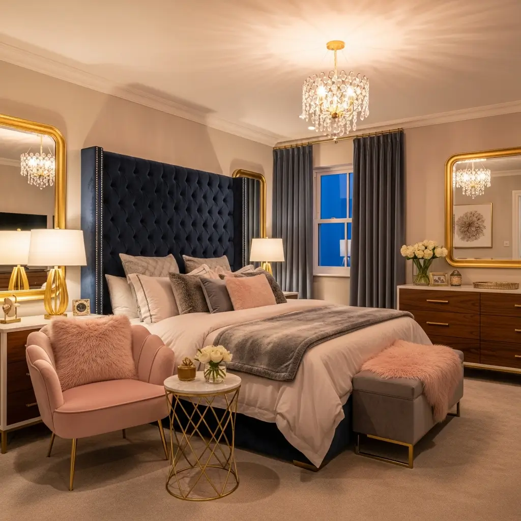 • Glamorous Accents: Incorporate gold or brass through intentional pieces like a statement chandelier, elegant bedside lamps, or a large ornate mirror. These metals enhance the sophisticated pairing.