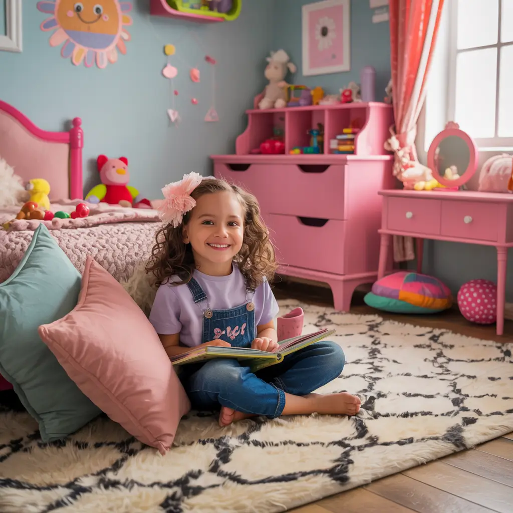 • Textured Comfort: Use soft, washable fabrics for bedding, rugs, and pillows. Think plush white rugs, pink knitted blankets, and soft blue cushions.
