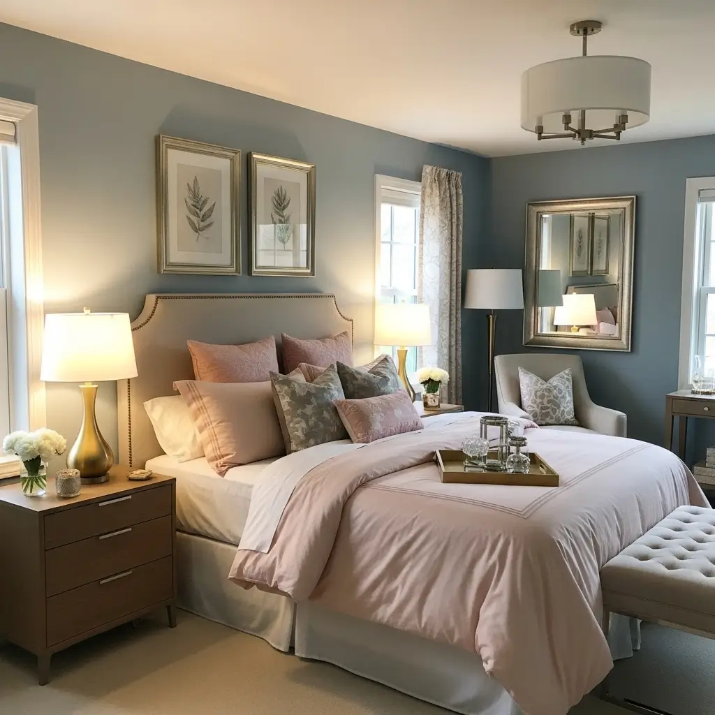 Transitional Blue & Pink Bedroom with Metallic Accents
