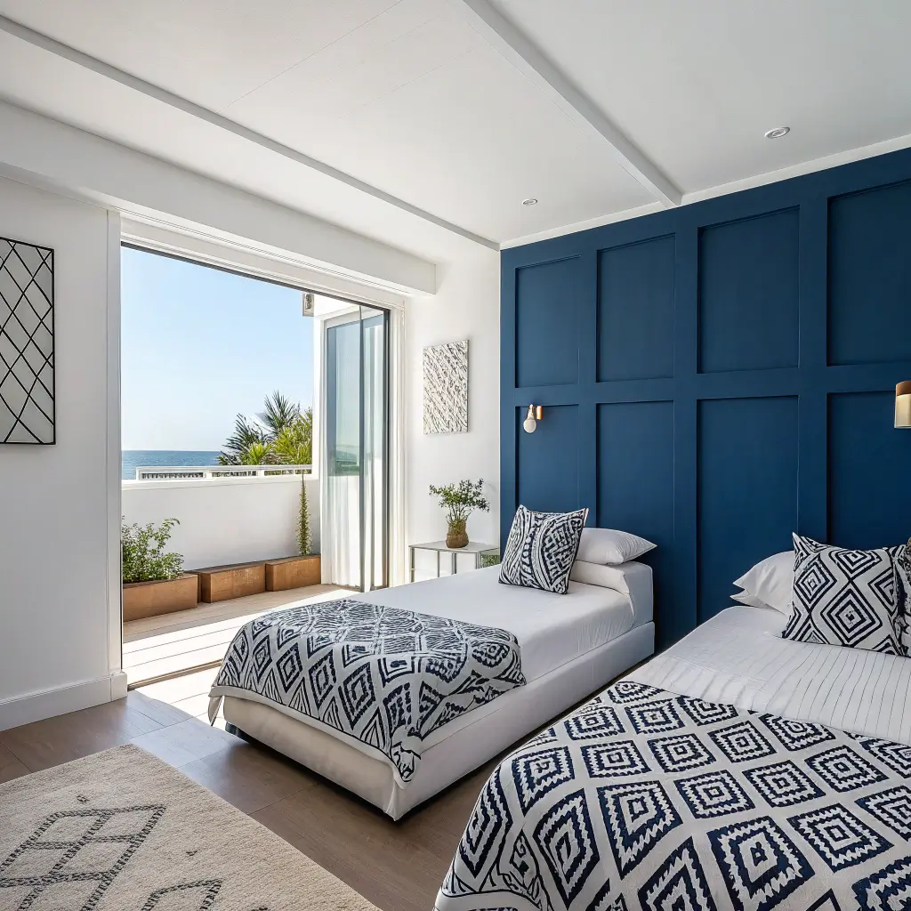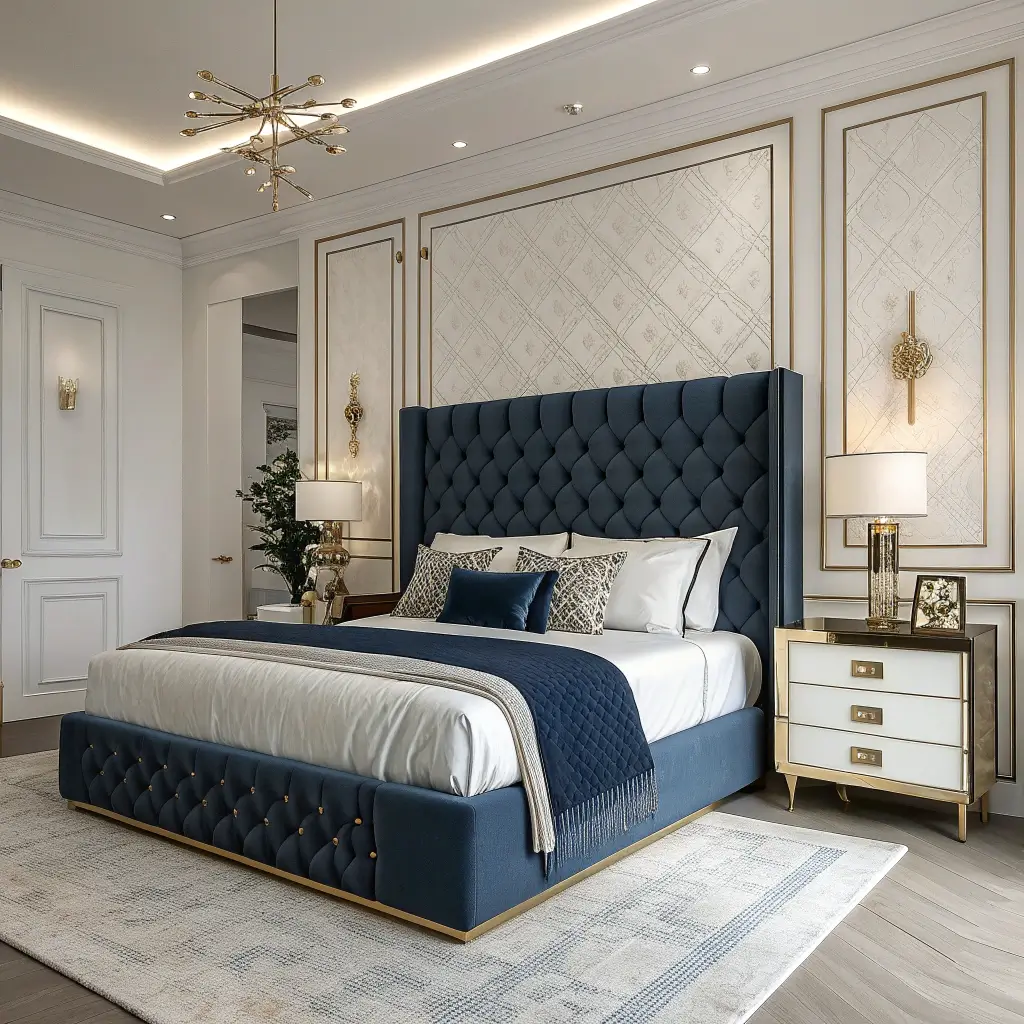 - Navy accent wall or upholstered headboard
