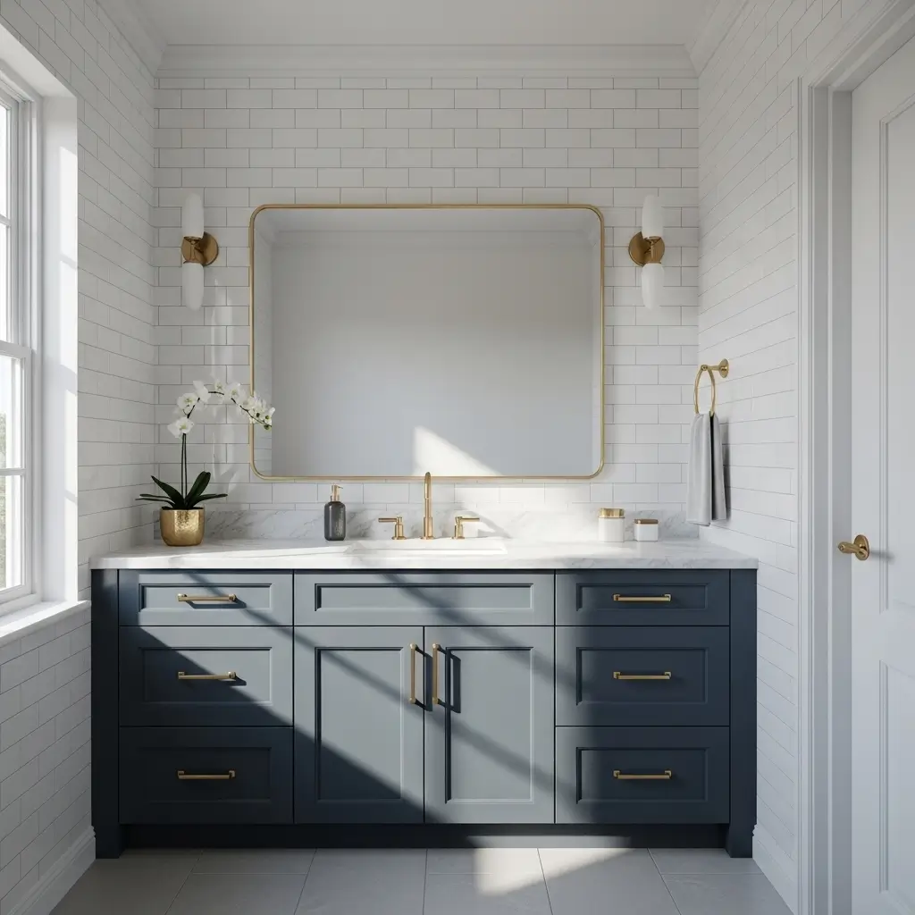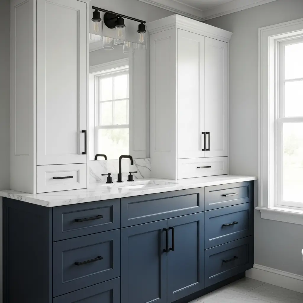 My favorite two-tone combination uses blue lower cabinets with white uppers. The blue grounds the space while white keeps things bright and open. I’ve also seen stunning bathrooms with blue vanities and white tall cabinets, creating distinct zones within the space.