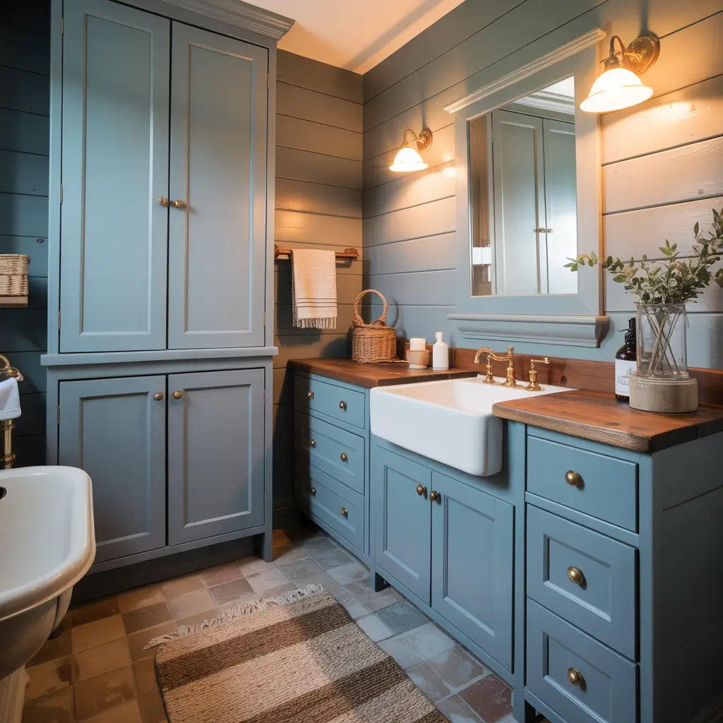 What I love about dusty blue in farmhouse bathrooms is how it plays with other textures. The soft color lets natural wood, vintage fixtures, and rustic accessories shine while adding its own layer of visual interest.