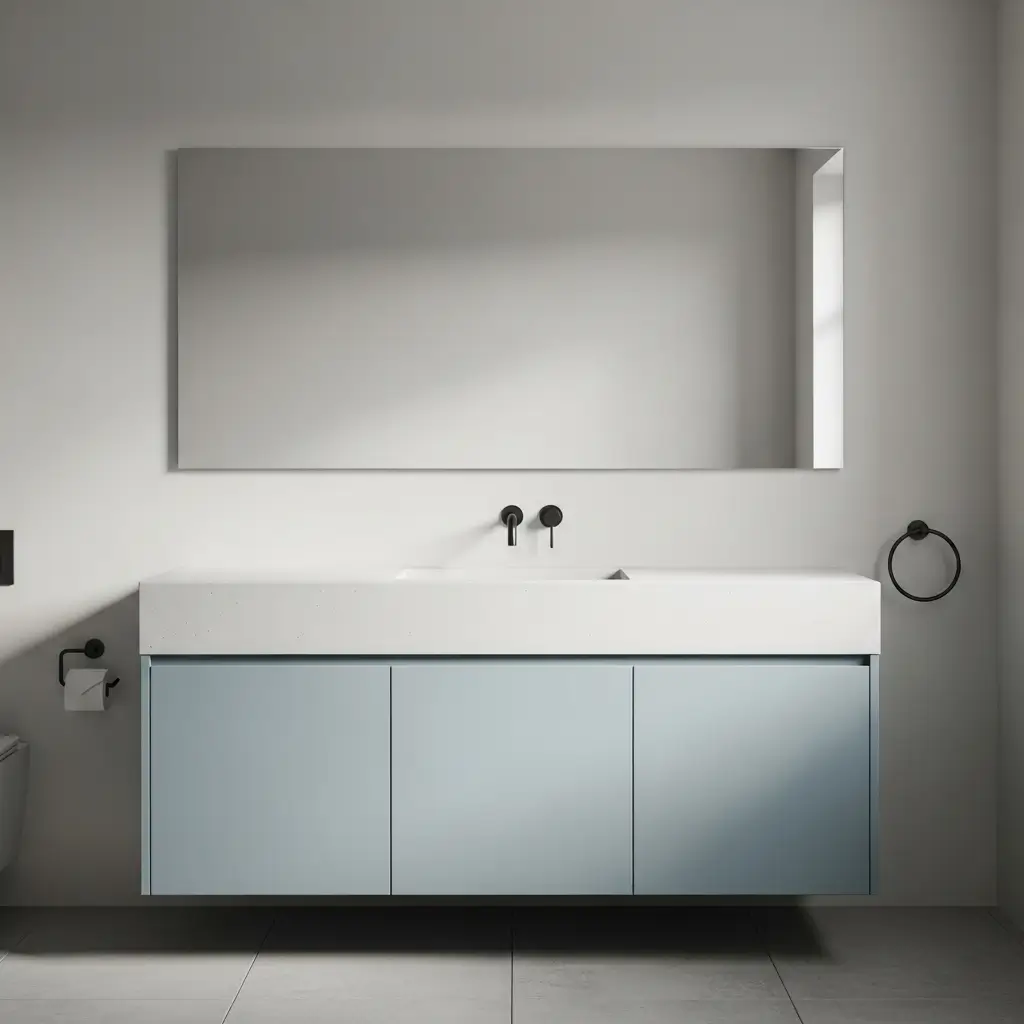 Who says minimalism has to mean white everything? A sky blue minimalist vanity proves that you can have color and simplicity in perfect harmony. This soft shade adds just enough personality without disrupting those clean, minimal lines.