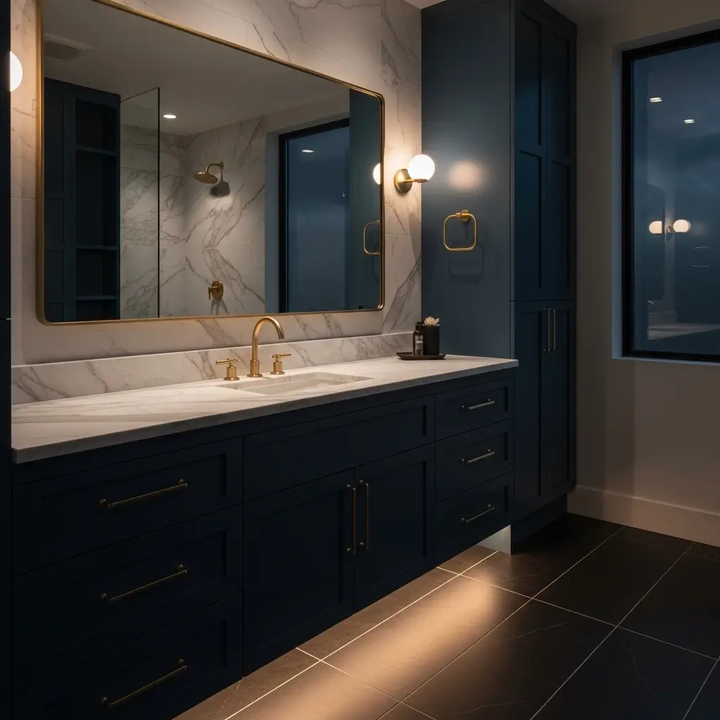FYI, I was terrified to go this dark in my bathroom, but midnight blue changed everything. The color reads as neutral from a distance but reveals beautiful blue undertones up close. Paired with Calacatta marble, it created this stunning high-contrast look that feels like a million bucks.