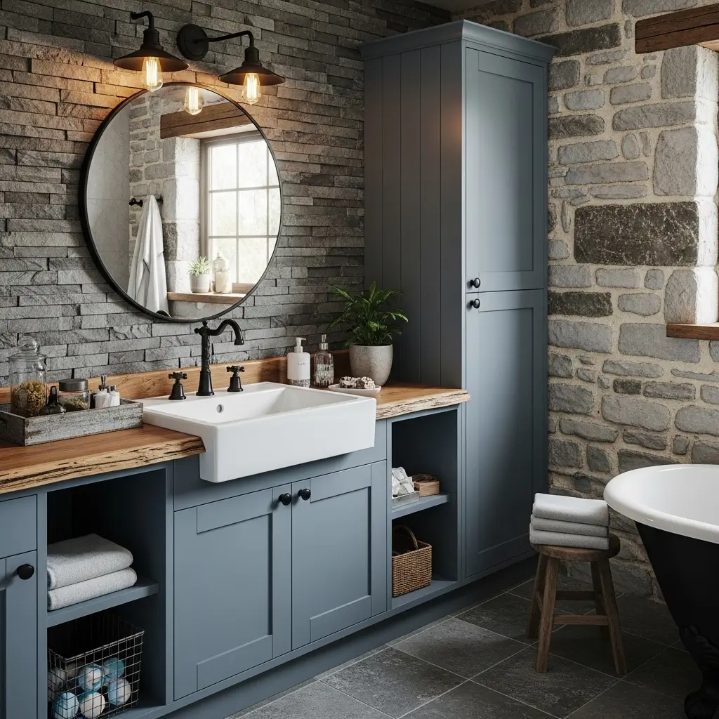 My cabin bathroom features slate blue cabinets that perfectly complement the reclaimed wood walls and stone vessel sink. The color adds refinement to rustic elements without losing that cozy, natural feeling. It’s like wearing designer jeans with hiking boots – unexpectedly perfect.