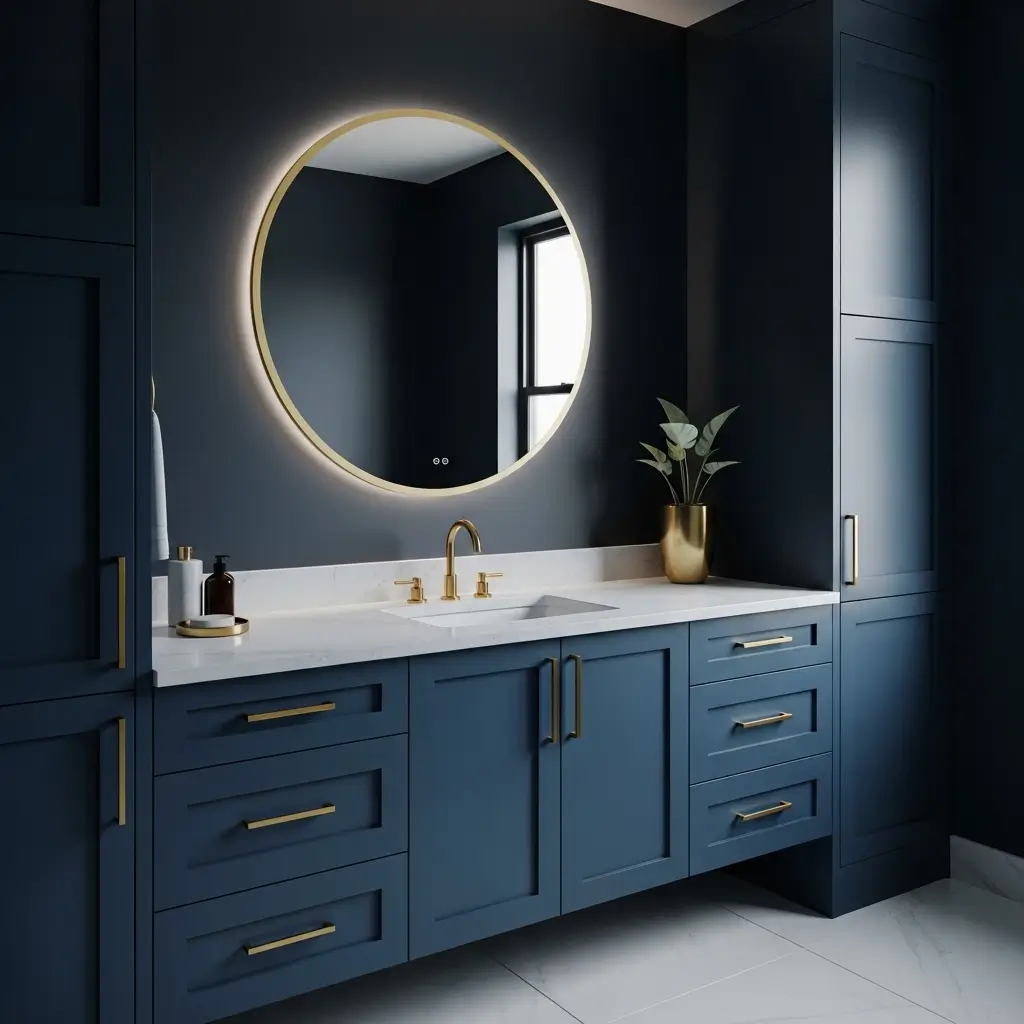 Sometimes you don’t want to commit to all blue cabinets, and that’s where royal blue accent cabinets come in. Maybe just the vanity, or a single tall cabinet – this approach lets you add drama without overwhelming the space.