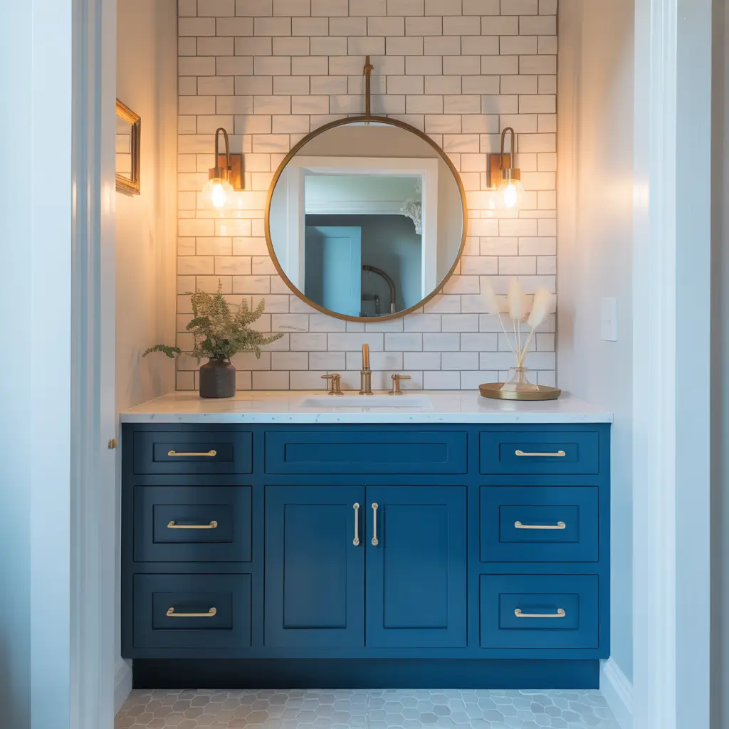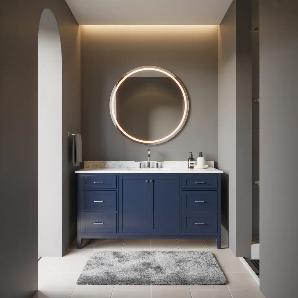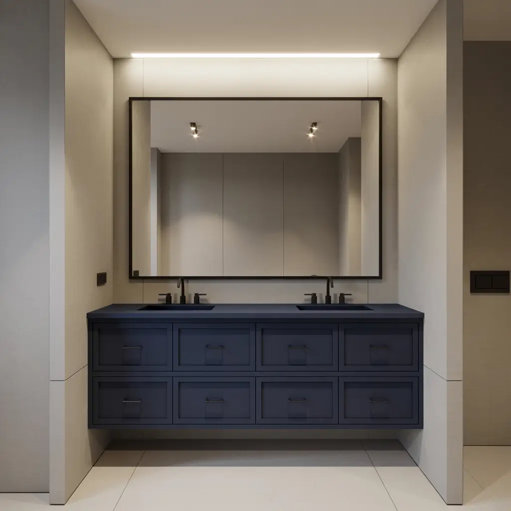 The trick with navy vanities is keeping everything else clean and simple. White walls, minimal clutter, maybe a geometric mirror – let the vanity be the star. I’ve seen people try to add too many colors, and it just muddles the whole vibe.