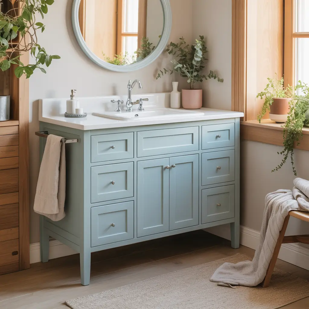 Sometimes you want color without commitment, right? That’s where light sky blue vanities come in clutch. They add personality without overwhelming your space – perfect if you’re not ready to go full navy.
