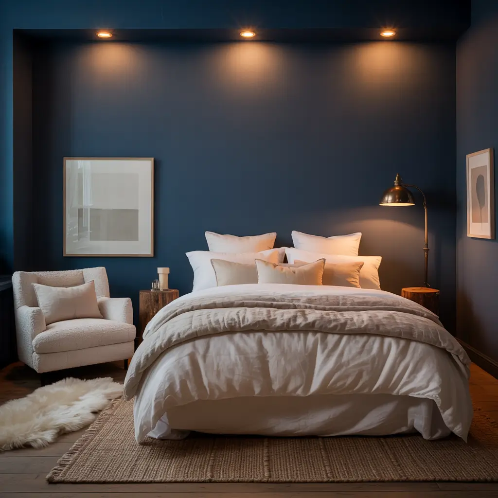 Pro tip: paint the ceiling the same navy as the walls for maximum coziness. It sounds dramatic, but it creates this incredible enveloping effect that makes the room feel like a luxurious retreat.