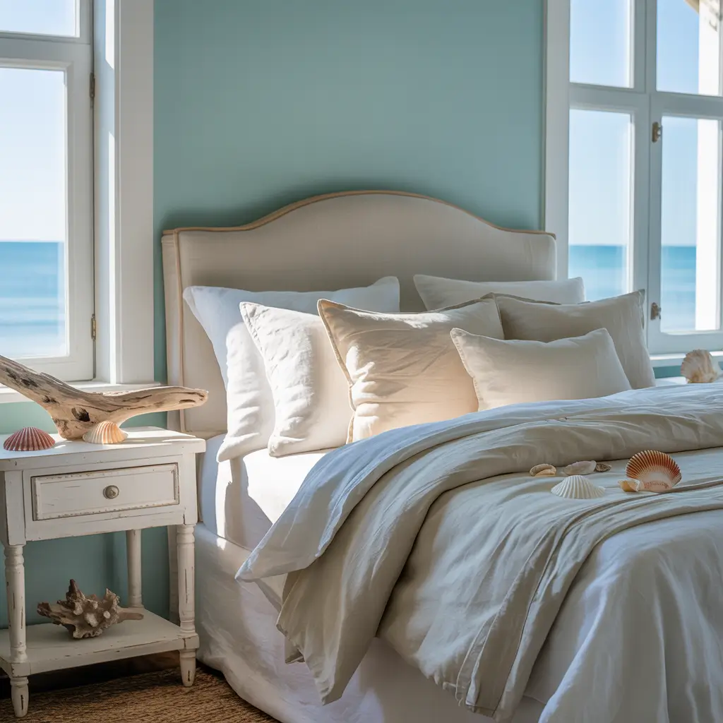 My friend transformed her landlord-beige bedroom into a coastal paradise without painting a single wall. She used aqua bedding, white furniture, and accessories in various blue-green tones. By the time she added woven textures and some simple shell accents, the room felt like a boutique beach hotel.