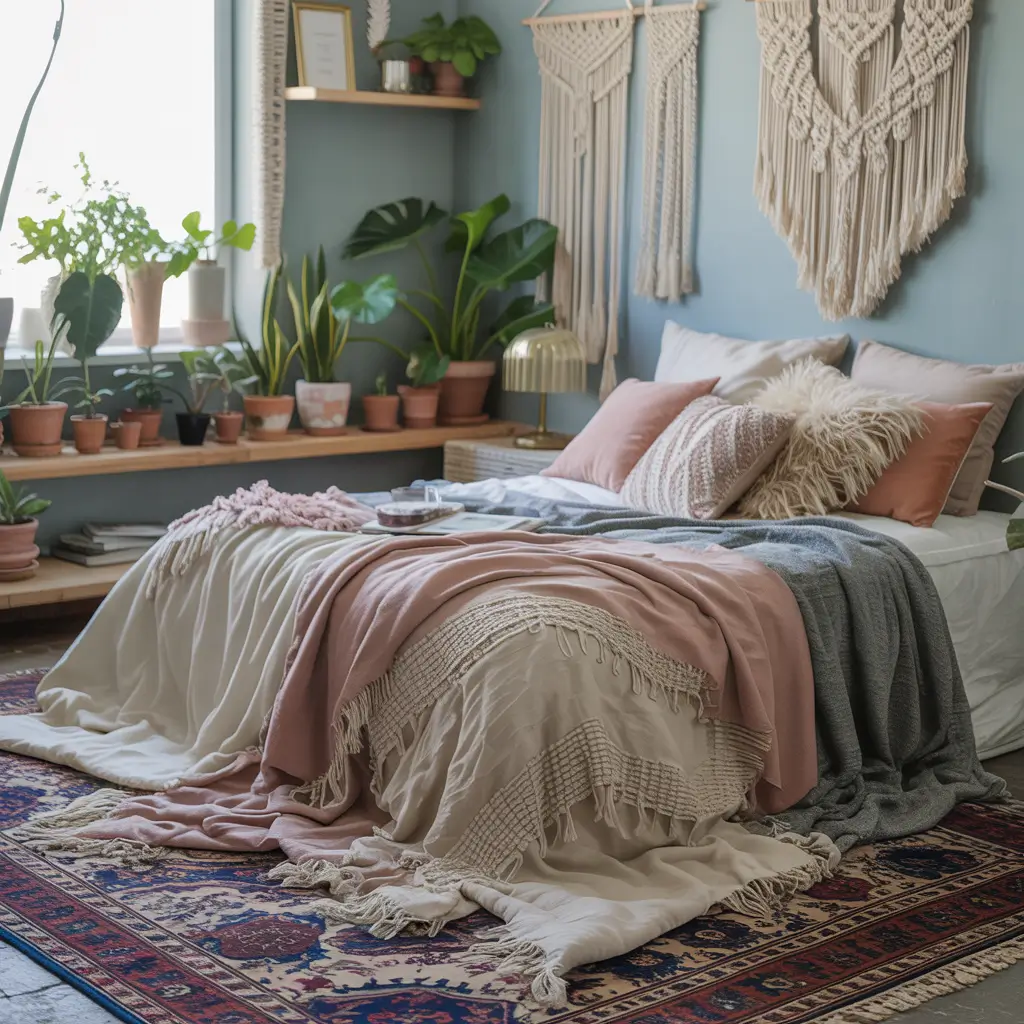 Boho and pastel blue might sound like an unexpected combination, but this pairing creates the most dreamy, romantic bedroom aesthetic. The soft blue grounds all those eclectic boho elements while adding a serene quality that pure neutrals can’t achieve.