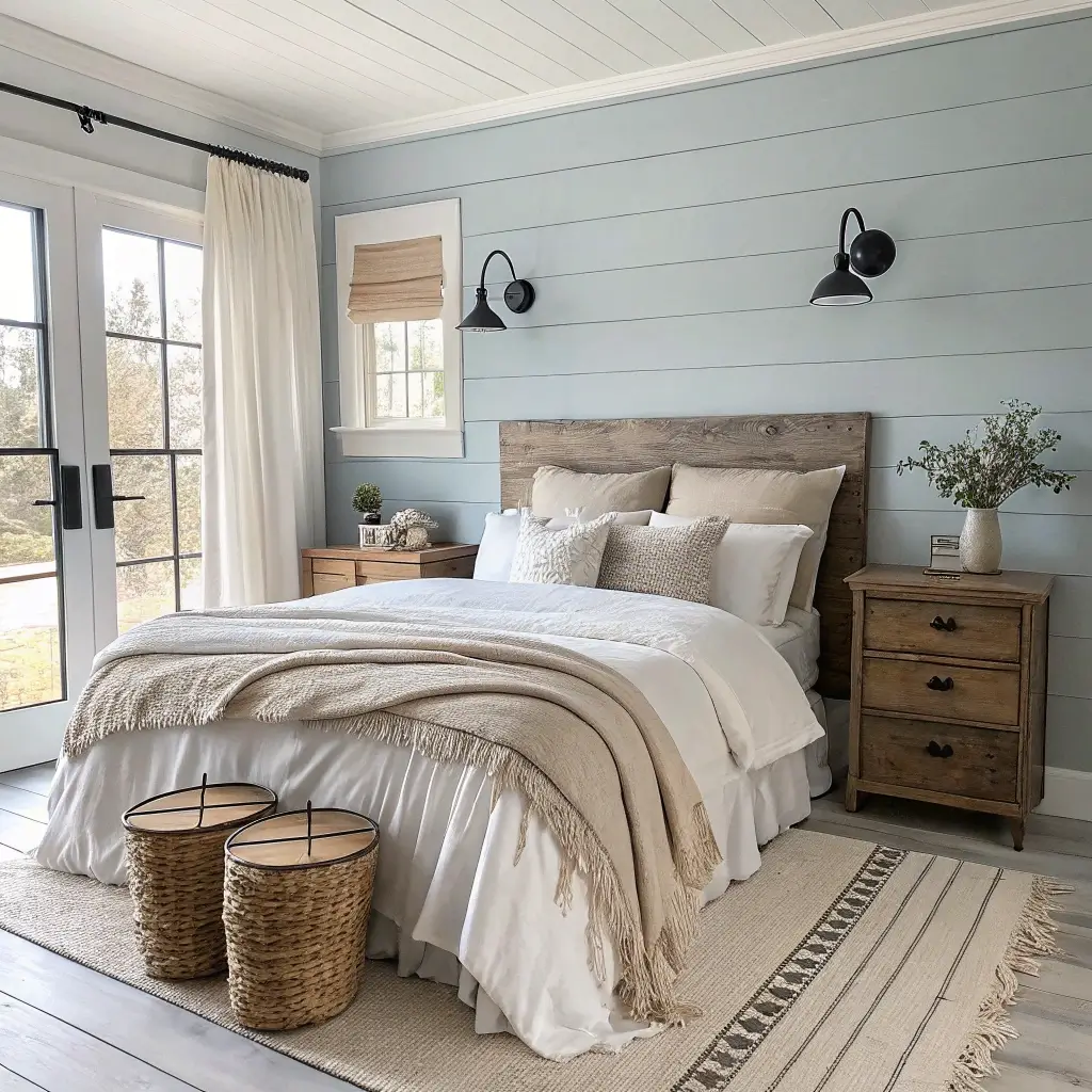 9. Light Blue Farmhouse Bedroom with Natural Textures