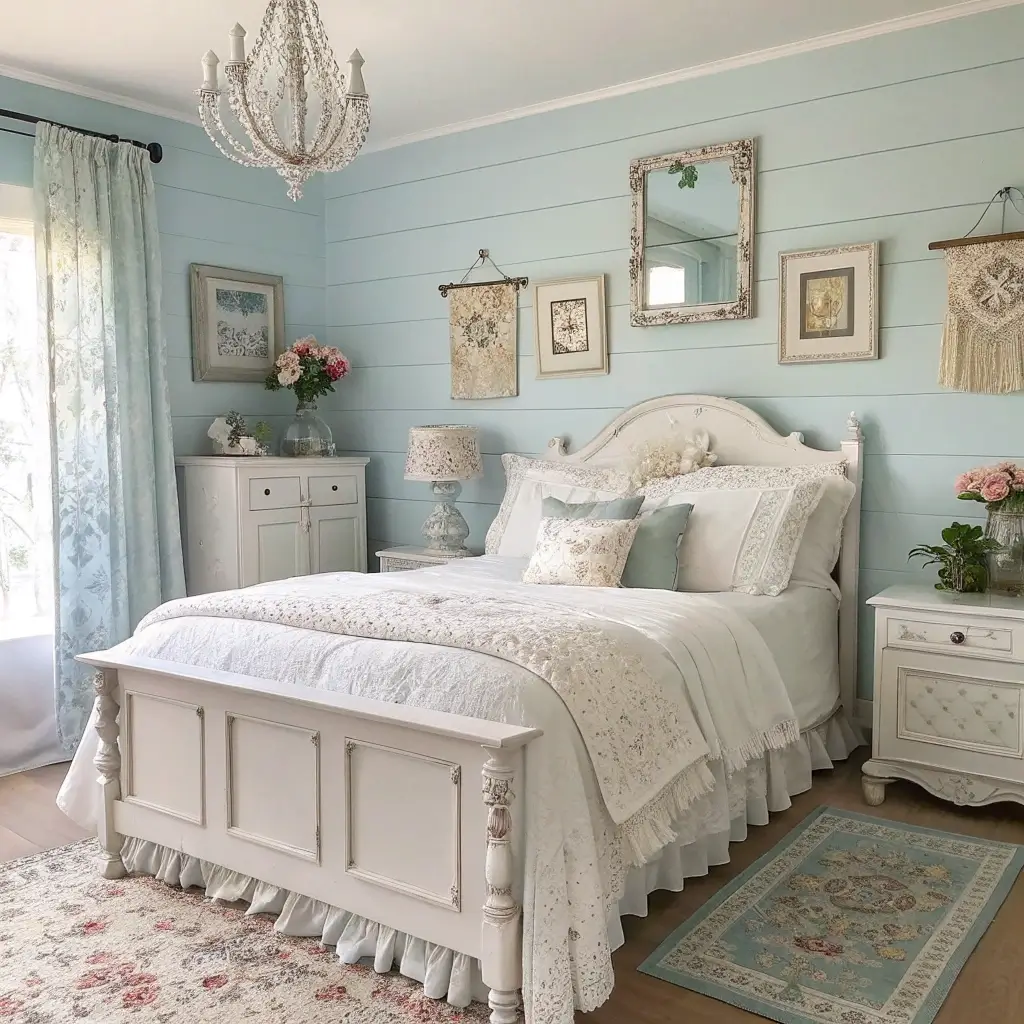 3. Soft Blue and White Vintage Farmhouse Bedroom