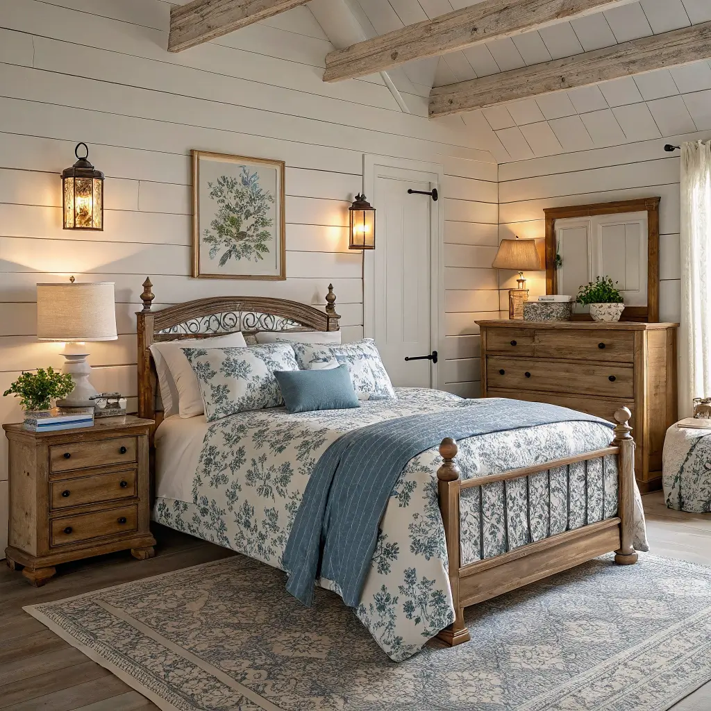 4. Blue Floral Farmhouse Bedroom with Antique Touches