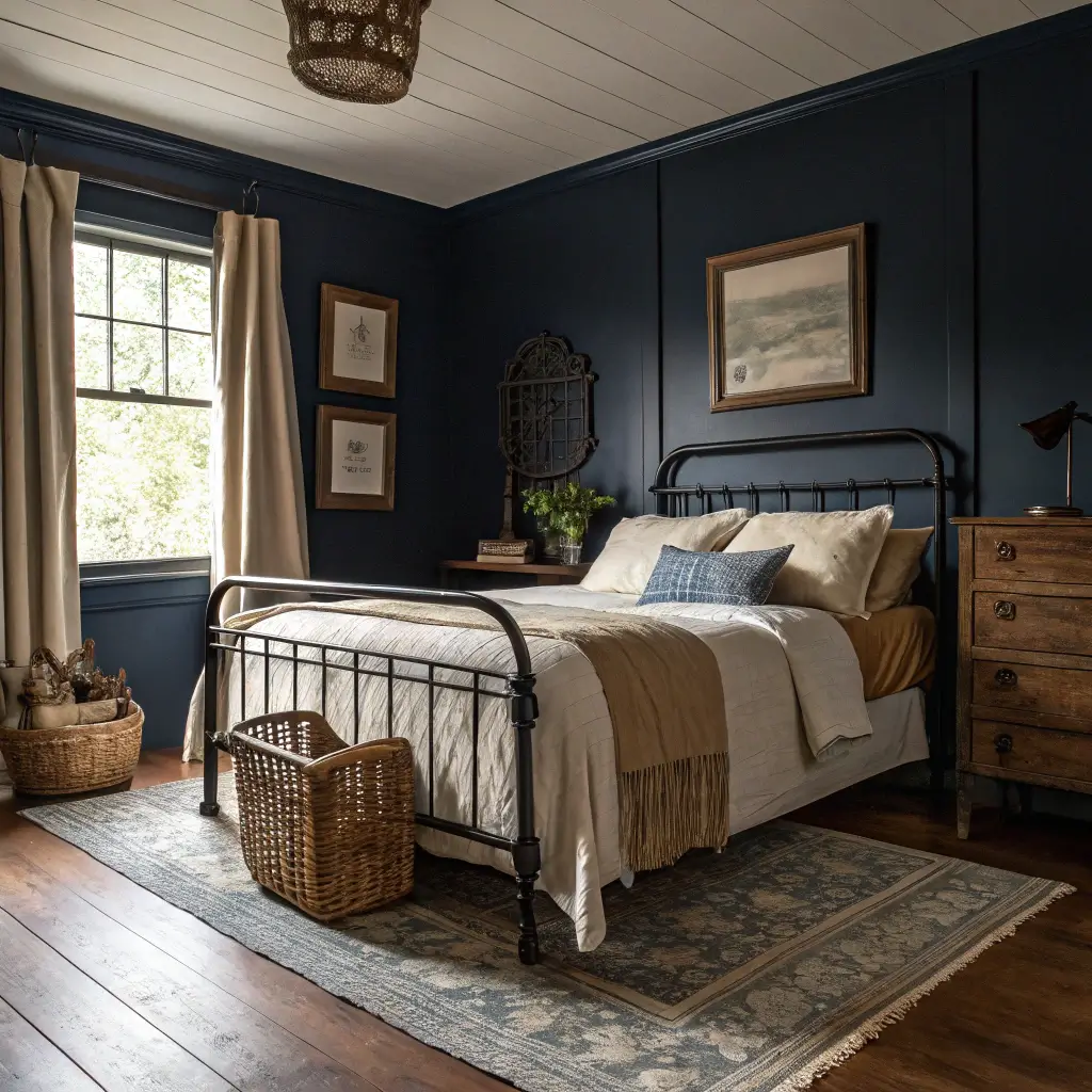 8. Indigo Farmhouse Bedroom with Wrought Iron Bed