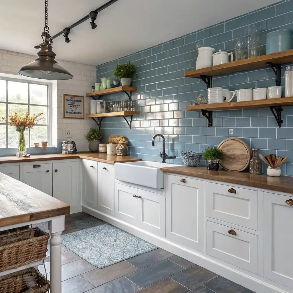 Coastal aesthetics and blue tiles share natural affinity. This pairing creates kitchens that feel like permanent vacation destinations.