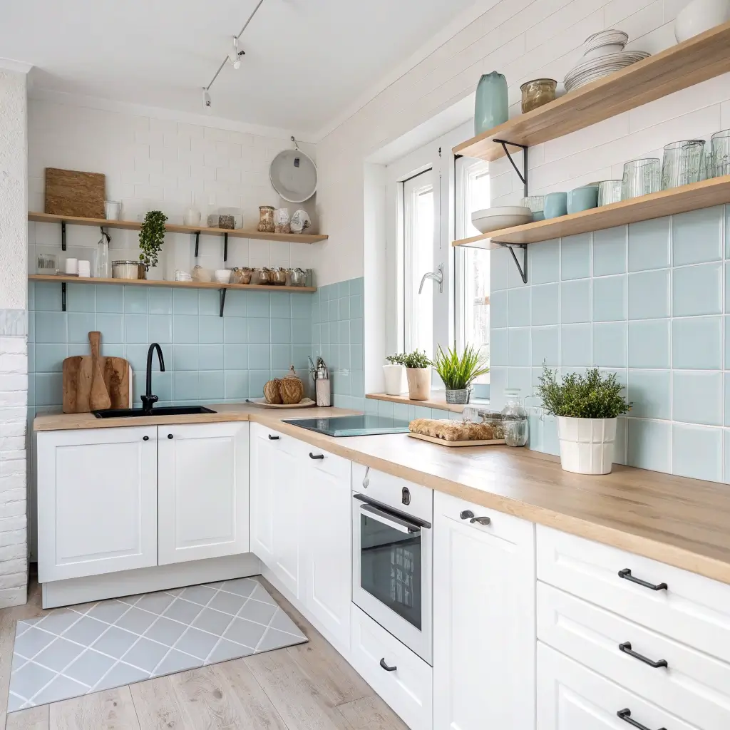 Scandinavian design embraces light, function, and gentle color. Pastel blue tiles enhance these principles while adding personality to minimal frameworks.