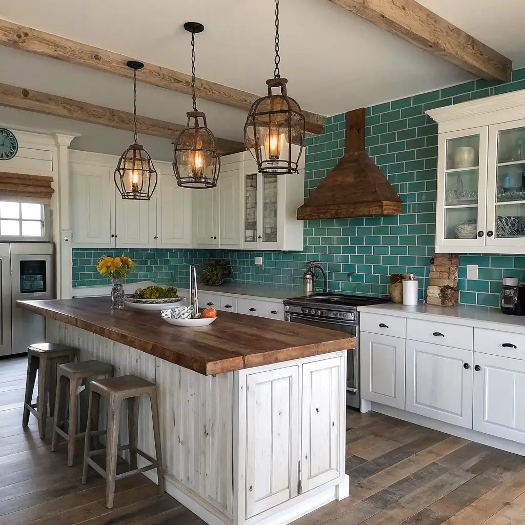 Teal blue rustic charm combines blue-green richness with weathered character. These kitchens feel warm, collected, and genuinely inviting.