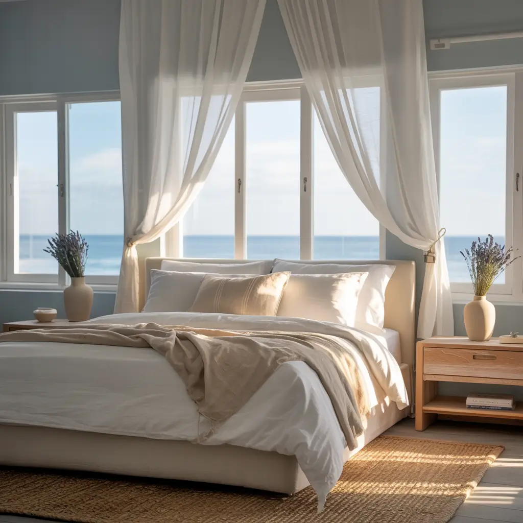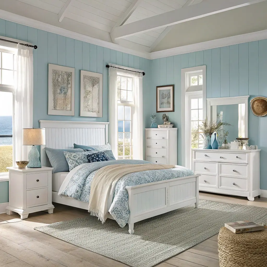 Blue and white creates foolproof bedroom perfection. Benjamin Moore’s Harbor Haze 2136-60 paired with bright white trim creates this crisp, clean look that never fails. My beach house rental uses this combination throughout, and guests consistently give five-star reviews.