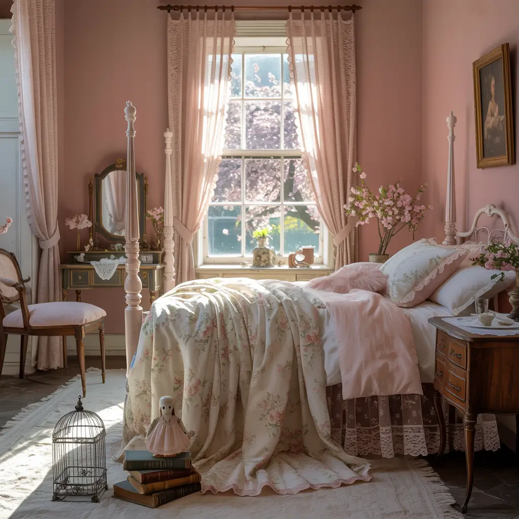 My aunt has a guest room decorated like this, and it’s truly a treasure. She has an antique iron bed frame, a vintage vanity, and delicate lace curtains, all softened by blush pink walls and textiles. It’s incredibly charming and makes you feel like you’ve stepped into a beautiful, bygone era.