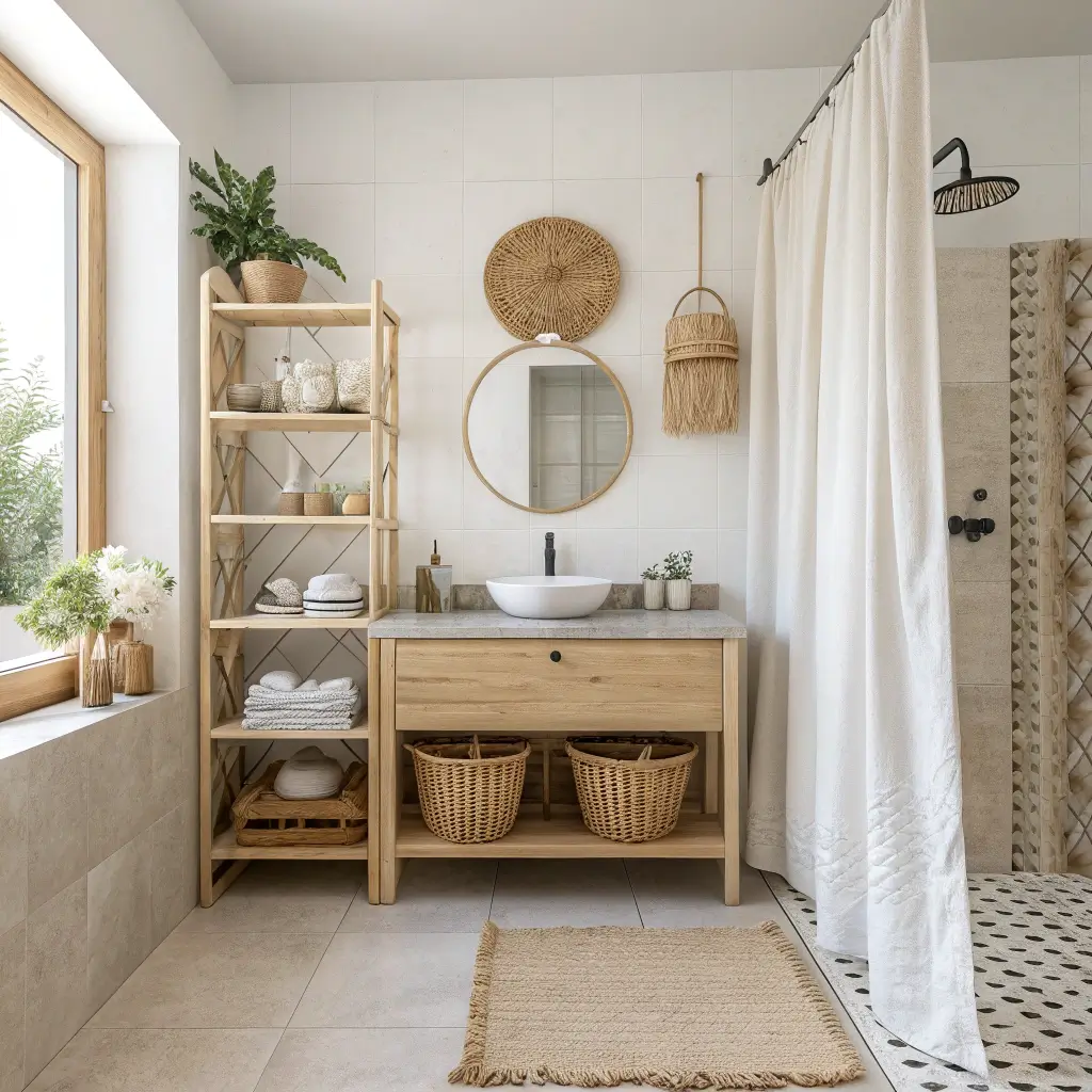 6. Neutral Boho Bathroom With Organic Details