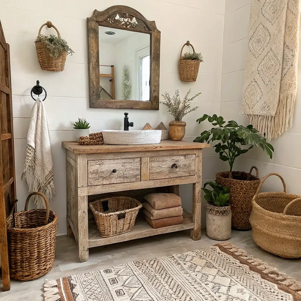 Rustic boho is like that cool aunt who travels the world and has the best stories. This style mixes weathered wood, vintage finds, and natural elements for a bathroom that feels collected over decades.