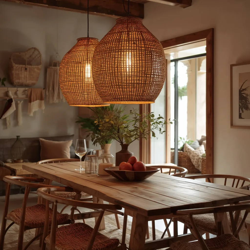 Let’s kick things off with one of my absolute favorite boho elements – rattan pendant lighting. I installed two oversized rattan pendants over my dining table last year, and honestly? Game changer. These beauties cast the most gorgeous shadows when the sun hits them just right.