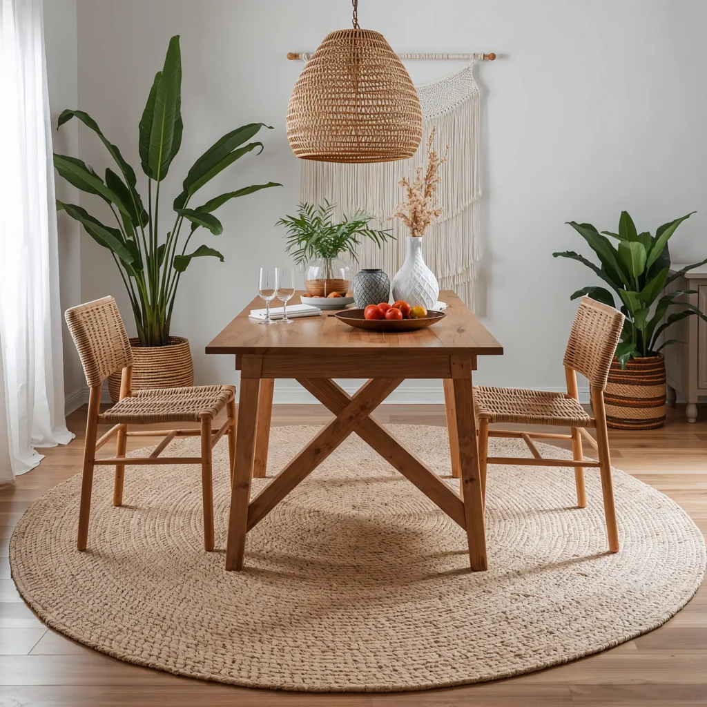 Let me paint you a picture: hardwood floors, a gorgeous dining table, and… nothing underneath. Boring, right? Enter woven jute rugs – the unsung heroes of boho dining rooms. I’ve tried synthetic rugs, Persian rugs, you name it. Nothing beats the organic texture of jute.
