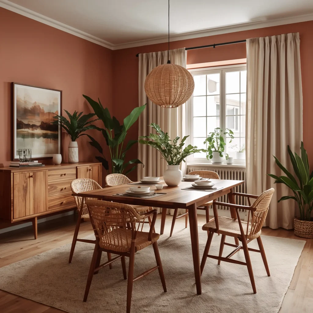 Here’s where things get fun. Earthy color palettes are the backbone of any boho dining room, but we’re not talking boring browns here. Think terracotta, dusty rose, sage green, ochre yellow – colors that remind you of desert sunsets and forest floors.