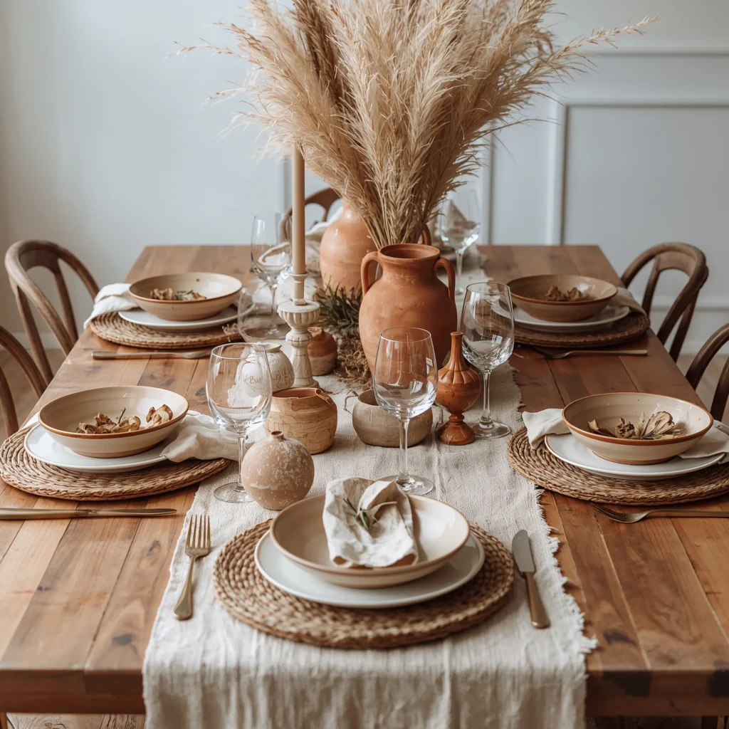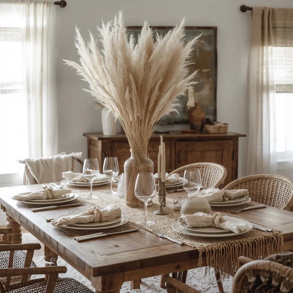 Last but definitely not least – the dried pampas grass centerpiece. Yes, it’s trendy. No, I don’t care. When styled right, pampas grass brings movement and organic beauty to your dining table without the maintenance of fresh flowers.