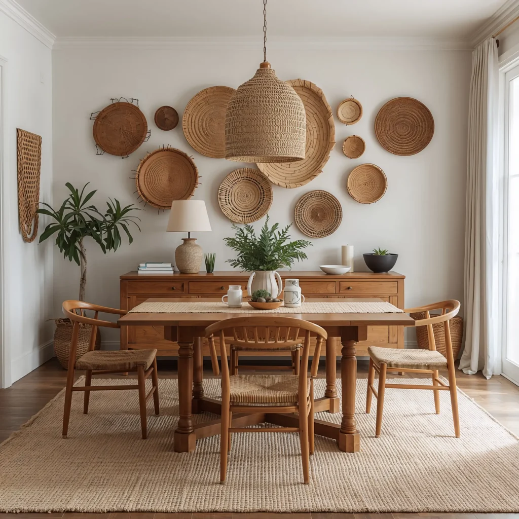 Here’s a secret: wicker baskets are the Swiss Army knife of boho decor. Wall art? Check. Storage solution? Check. Plant holders? Double check. I’ve got them everywhere in my dining room, and each one serves a purpose while looking gorgeously textural.
