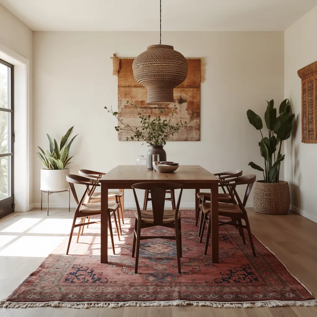 If jute rugs are the foundation, vintage Moroccan rugs are the showstoppers. These beauties bring color, pattern, and instant authenticity to any boho dining room. Fair warning: once you buy one, you’ll become slightly obsessed with collecting more.