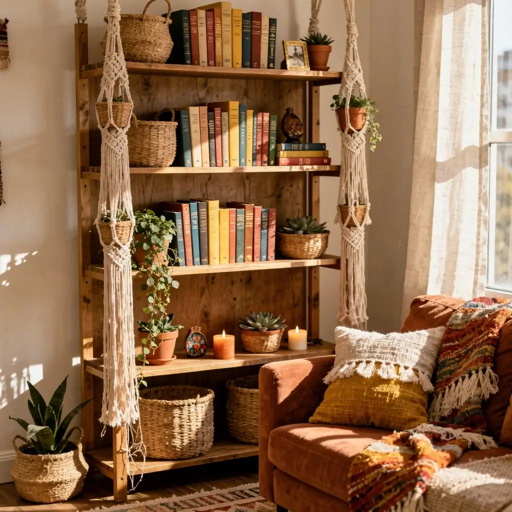If minimalism feels too sterile for your taste, you might prefer a cozy boho layered decor. This style celebrates life, color, and texture. I find that the “organized chaos” of a Boho shelf actually sparks my creativity when I feel stuck on a project.
