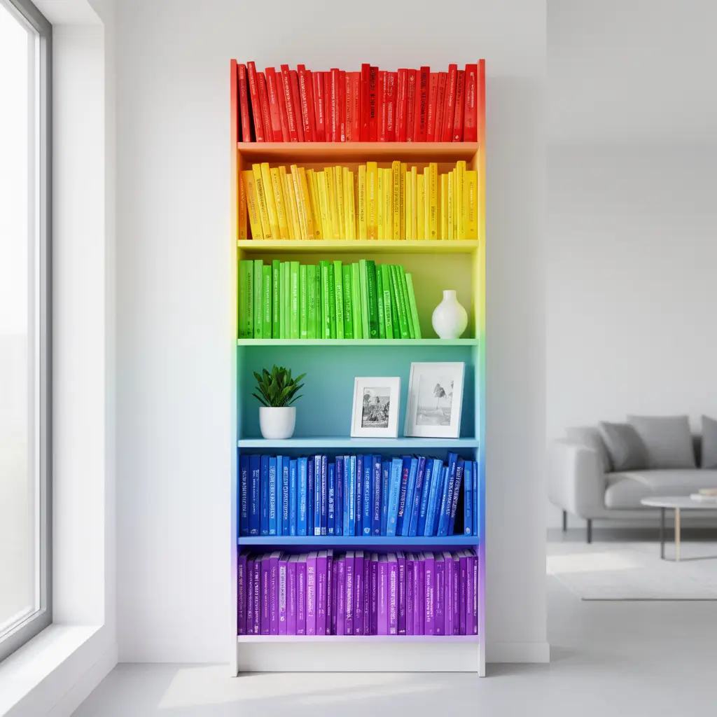 - Start with a neutral bookshelf (white or black) to make the colors pop.