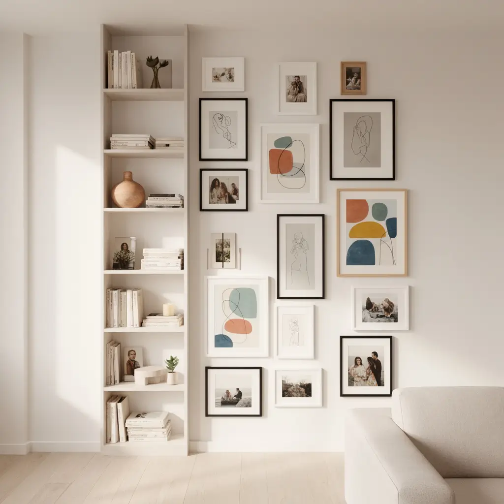 I recommend using a mix of frame styles—some wood, some metal, some painted. This creates an eclectic, “collected” look. You can also mix photos with abstract prints, vintage postcards, or even your kid’s drawings. This style tells your personal story in a way that just books cannot.