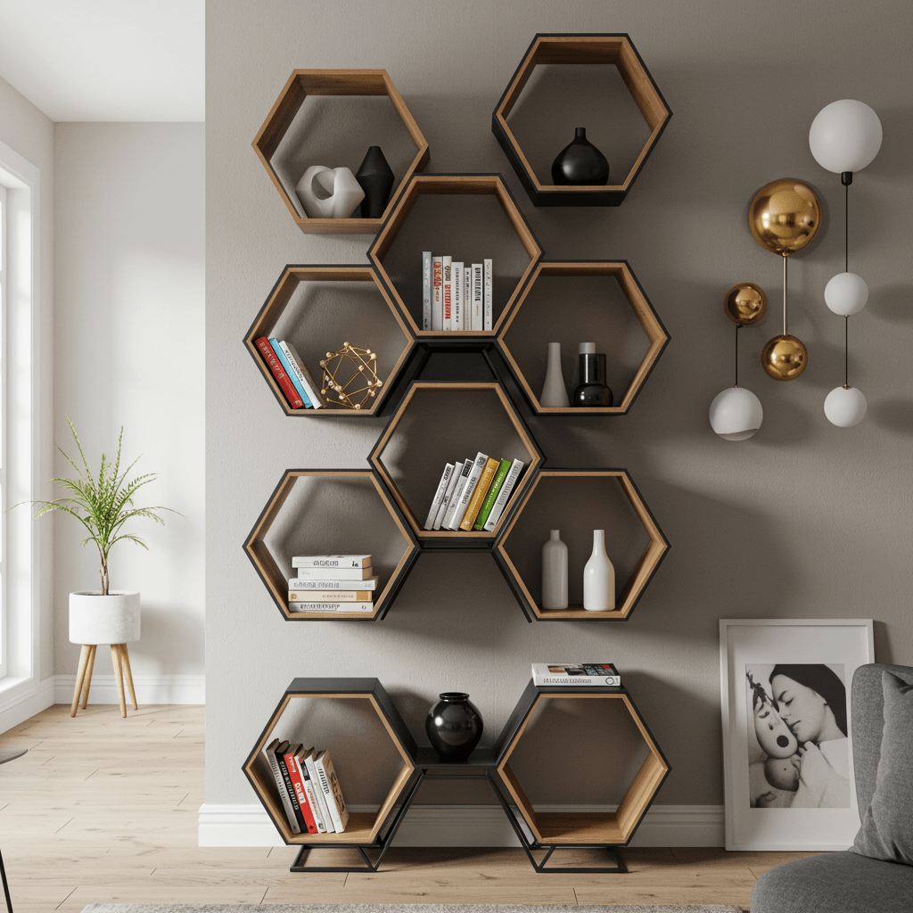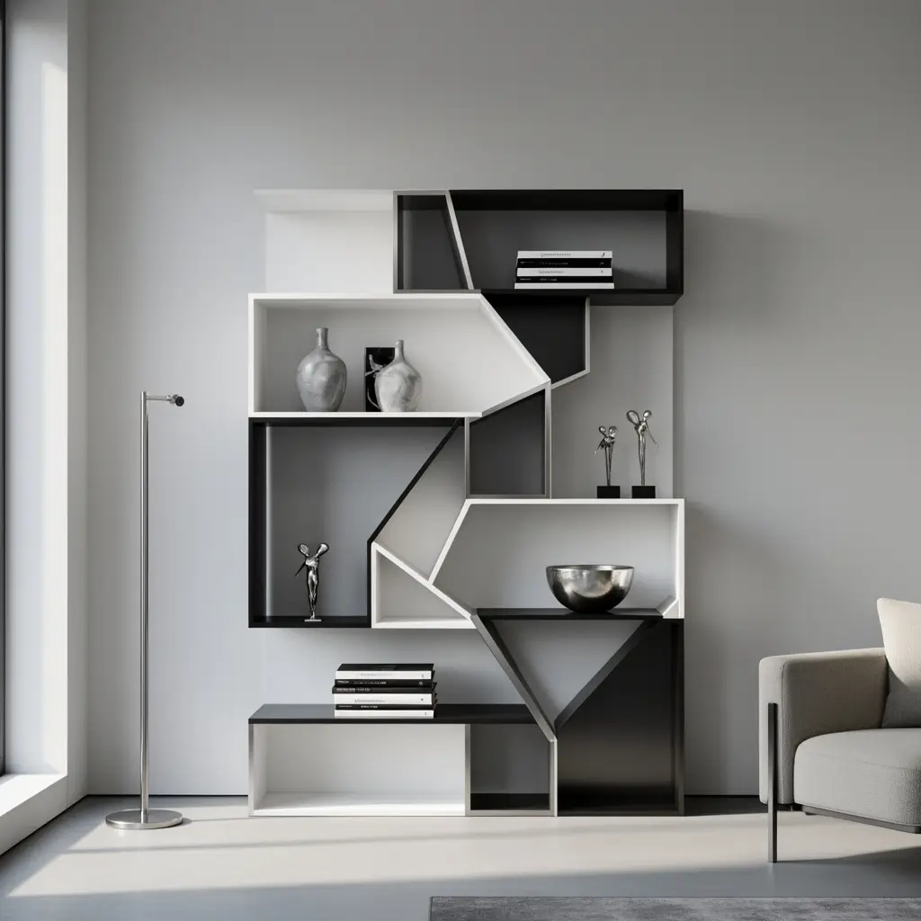 If you prefer clean lines and a high-end, architectural look, geometric & modern shelf styling is for you. This approach uses bold shapes and a “less is more” philosophy to turn your bookshelf into a piece of modern art.