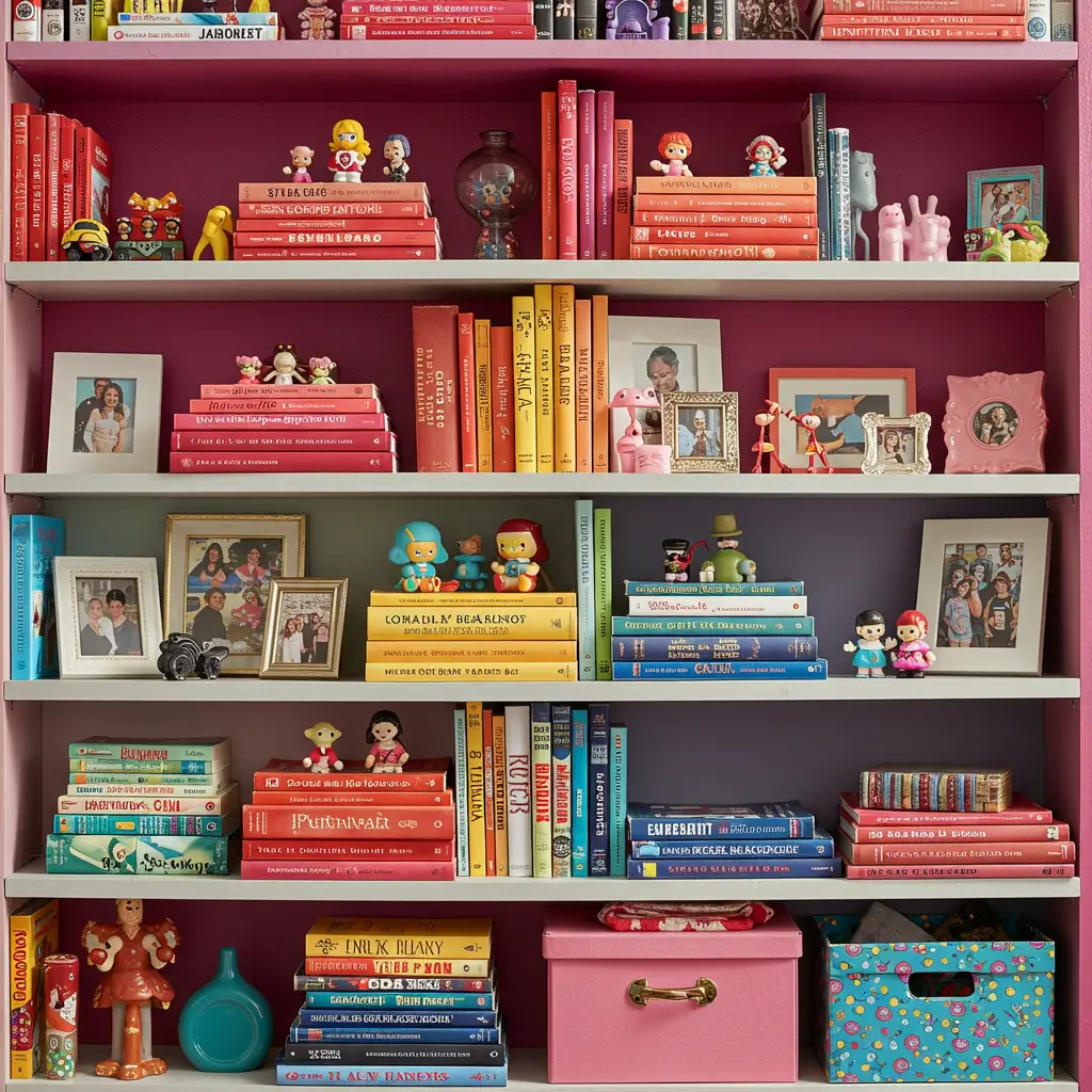 - Start with a neutral bookshelf (white or black) to make the colors pop.