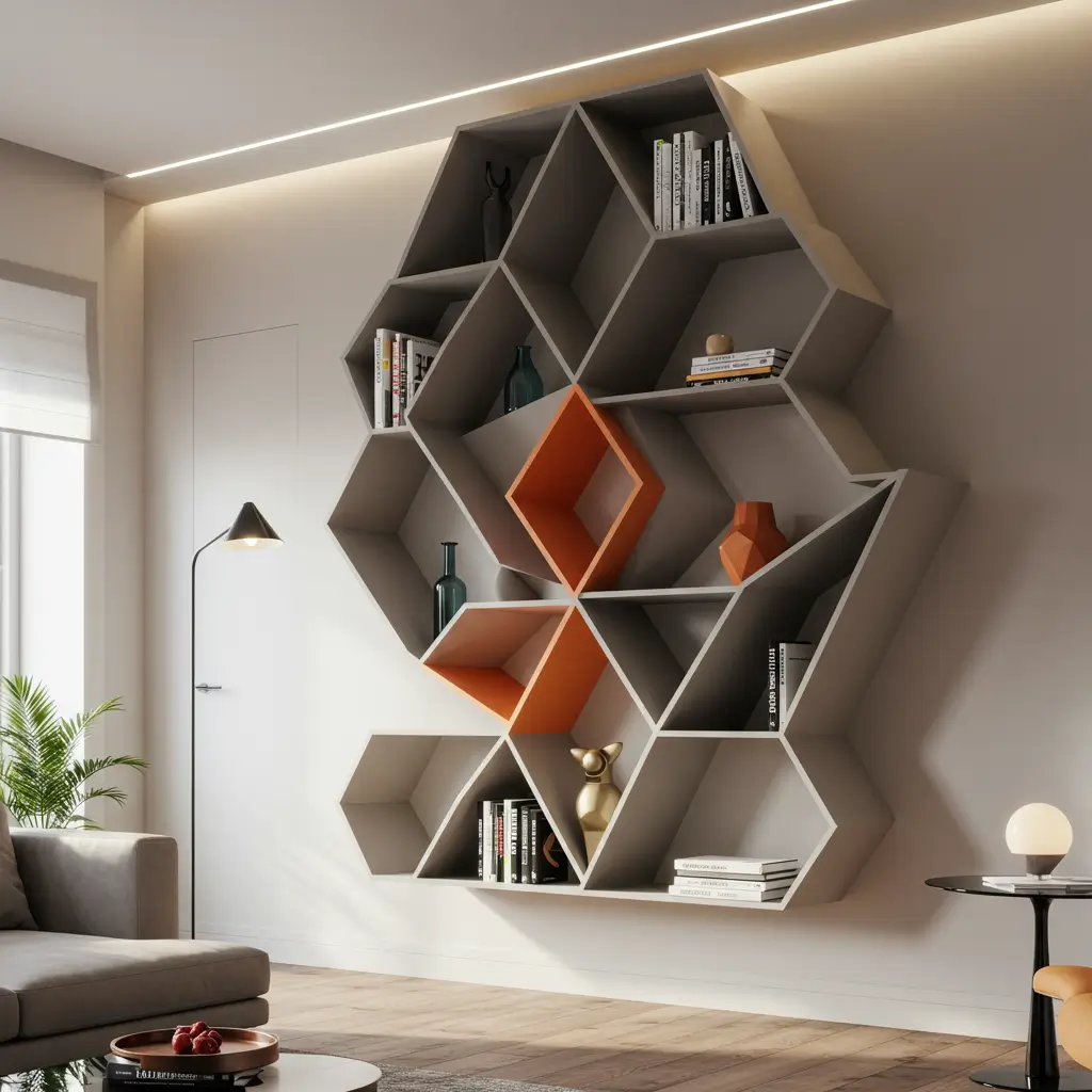If you love clean lines and a high-end, architectural look, modern geometric bookshelf designs are for you. This approach uses bold shapes and a “less is more” philosophy to turn your bookshelf into a piece of modern art.