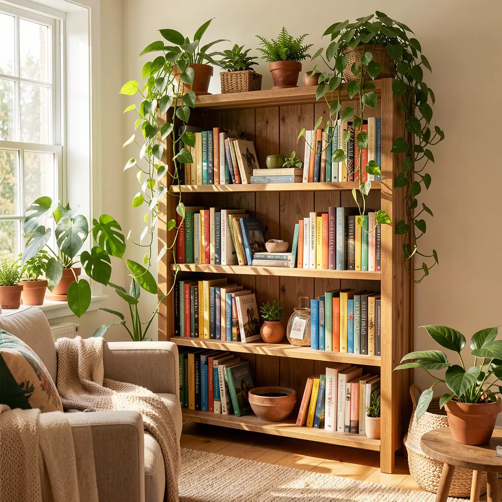 I recommend placing plants at different heights to create a “canopy” effect. Put a trailing Pothos or Philodendron on a high shelf so its vines hang down over the books. Place a small succulent or a ZZ plant next to a horizontal stack of books to add a pop of green.