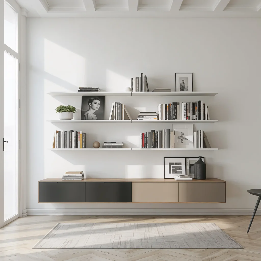 Modern floating shelves offer flexibility that traditional bookcases can’t match. You control the spacing, the arrangement, the entire narrative of your wall. I installed three staggered floating shelves in my living room, and guests always ask if I hired a designer. (Spoiler: I didn’t.)