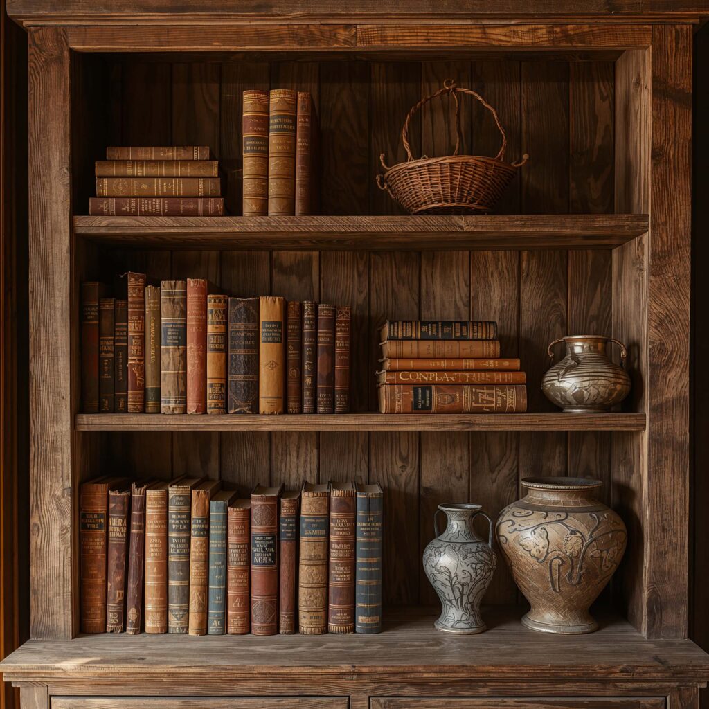 Building a vintage-inspired bookshelf doesn’t mean everything needs to be actually old (though thrift stores are goldmines). Mix these elements for authentic rustic vibes: