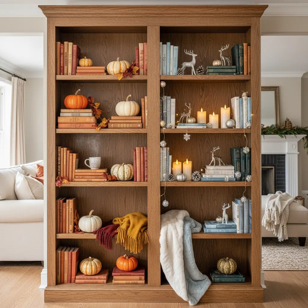 Creating consistent warmth across seasons means choosing a neutral base that works year-round. My shelves feature warm wood tones and cream colors that complement every seasonal addition. This stable foundation means seasonal changes enhance rather than overhaul the cozy atmosphere.