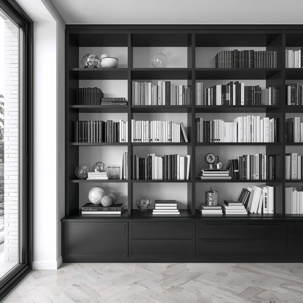 Here’s where things get fun. With monochrome wallpaper, you can go wild with colorful book spines or keep things zen with a color-coordinated collection. Both approaches work brilliantly.