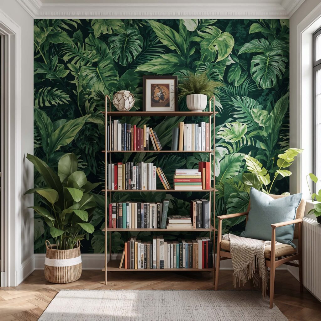 Scale plays a huge role in botanical wallpaper success. Large-scale leaves and flowers work best behind bigger bookshelves, while delicate fern patterns suit smaller, more intimate spaces.
