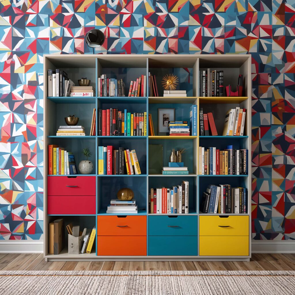 Ready to make a statement? Vibrant geometric wallpaper transforms your bookshelf from storage solution to art installation. We’re talking bold triangles, eye-catching hexagons, and dynamic patterns that refuse to be ignored.